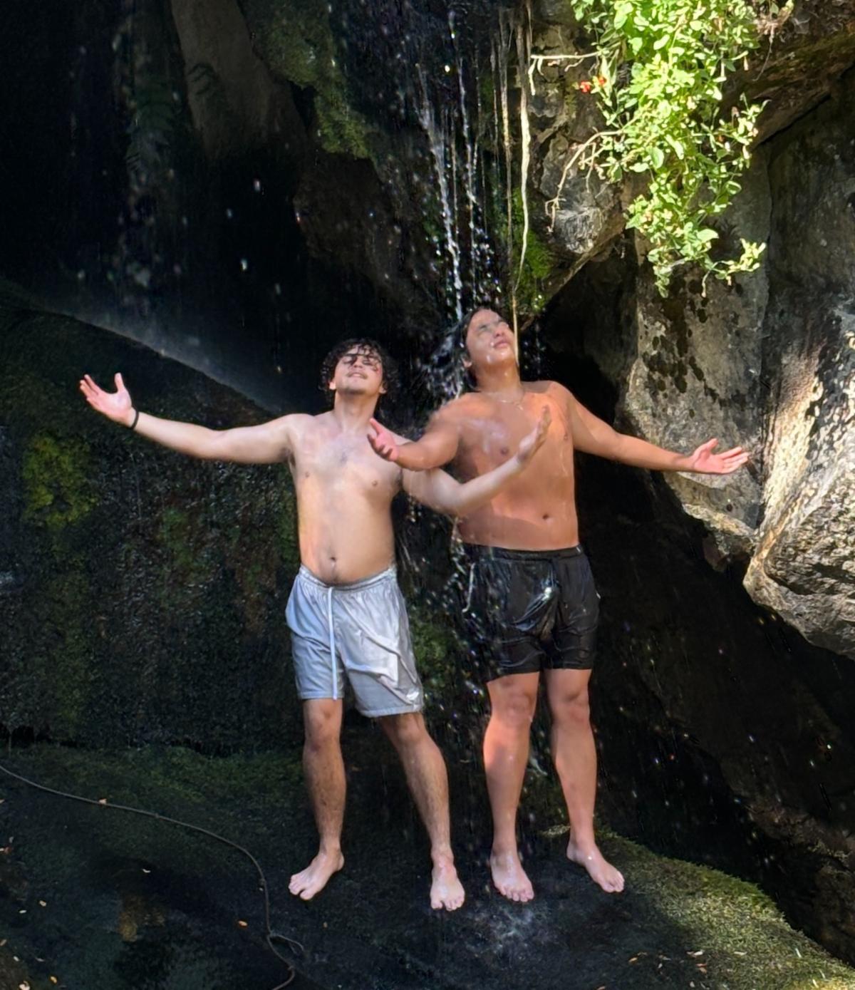 Juan with a cabin-mate at camp, enjoying a hike to a waterfall.